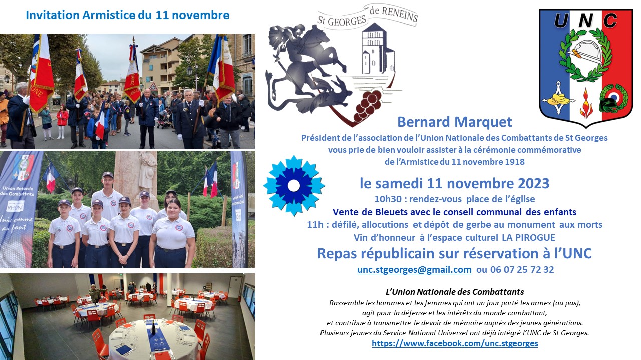 Nous vous attendons ce samedi 11 novembre 2023 à 10h30 sur la place de l’Eglise et nous vous invitons à réserver votre repas républicain à la Pirogue en appelant le 06 07 25 72 32 ou en adressant un message à unc.stgeorges@gmail.com.